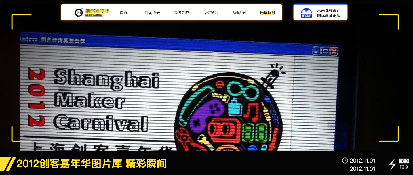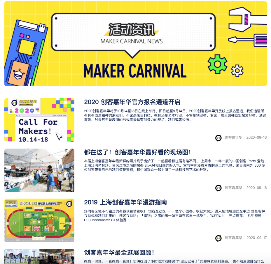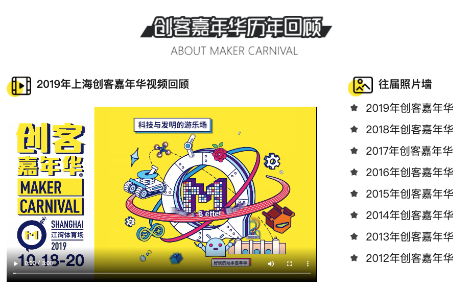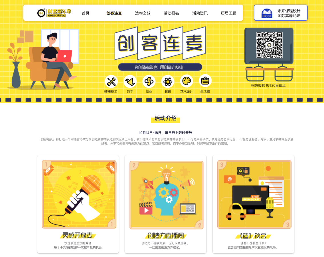 官方网站主要分为『创客连麦』、『造物之城』、『活动资讯』、『历届回顾』四大板块。
